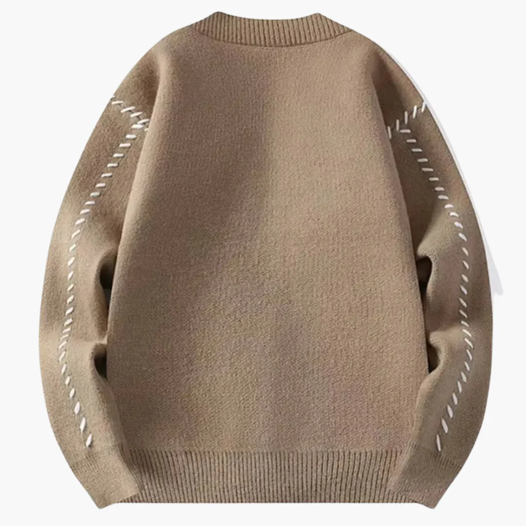 This men's cardigan includes a V-neckline, full front button fastening, and long sleeves. The ribbed cuffs and hem create a defined outline. The knitted texture with subtle stitched detailing adds depth, making it ideal for layering during cooler months.