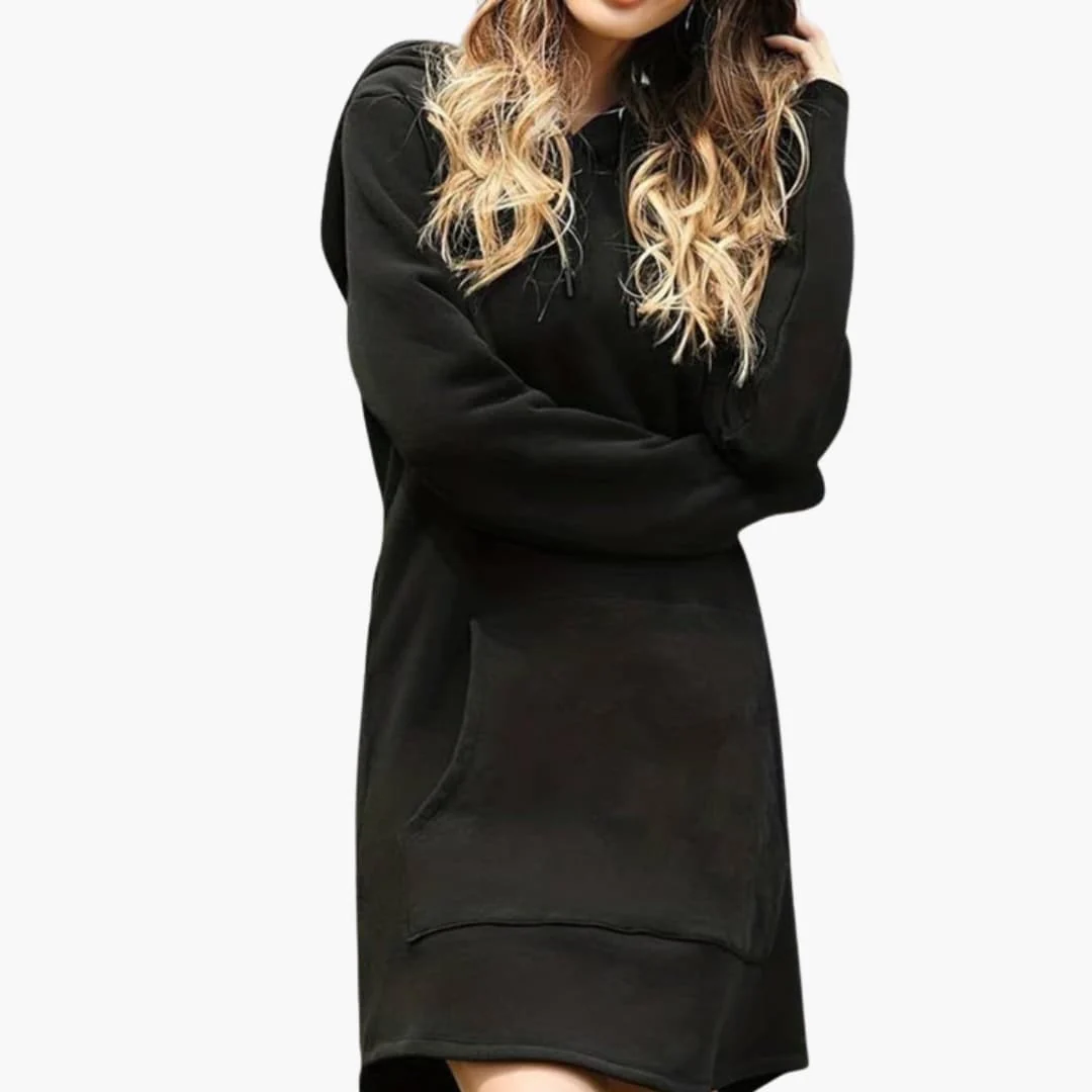 Women’s hoodie dress featuring a drawstring hooded neckline and long sleeves. Designed with a straight waist silhouette and a plain woven surface finish. The dress includes a front kangaroo pocket and a slightly rounded hem edge. The exterior features a continuous plain appearance with no visible fasteners.