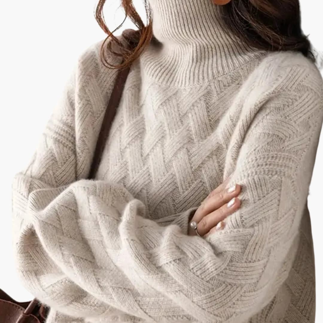 This women's sweater features a high turtleneck collar and long sleeves with ribbed cuffs. The woven knit texture shows an interlaced pattern across the front and sleeves, adding visual depth and structure. A straight ribbed hem completes the design, creating a balanced silhouette that's ideal for layering during transitional seasons.