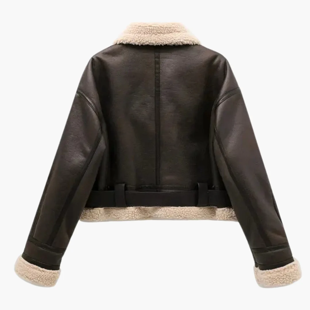 This women’s jacket includes a front zipper closure and an inner lining. It features a turn-down collar, long sleeves, and two zipped front pockets. The belted hem allows adjustment at the waist. Its structured silhouette and cropped length make it practical for layering in cooler weather.
